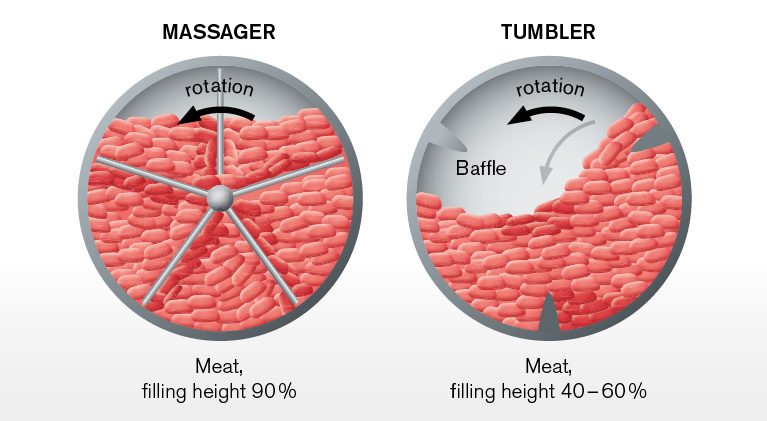 - Une large gamme d'améliorations permet d'adapter de manière optimale la technologie de massage MAX aux processus de fabrication individuels. Le conteneur de chargement MAX optimise le cycle du processus grâce au pré-mélange contrôlé par programme des produits avec des marinades (saumure) et des additifs. Le chargement sous vide permet un approvisionnement efficace et hygiénique des produits. Une décharge manuelle ou automatique est possible.