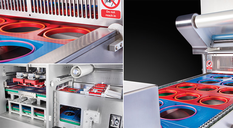 - Contrôle entièrement intégré de la machine, des distributeurs de plateaux et de couvercles, des têtes de remplissage et de pesage.