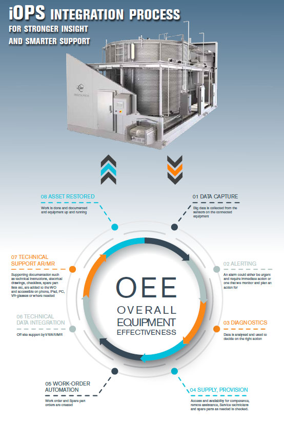 The technology enables customers to gain a far clearer idea of the true state of their Overall Equipment Effectiveness (OEE). Jean Bülow, JBT´s iOPS manager, explains: “Today, most maintenance is preventive or reactive, but not predictive. By employing remote equipment monitoring we can foresee issues ahead of their occurrence, thereby saving money and time. This allows us to move from measuring a single parameter to proactive actions based on trends and expert analysis.”