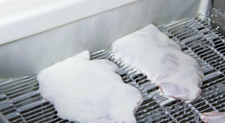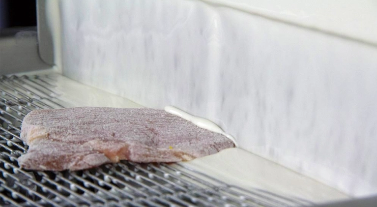 Battering is mainly used in combination with predusting/flouring and/or breading. The process is most frequently used to apply an adhesive layer for the subsequent breadcrumbs. Through the use of powerful pumps, it is possible to process both thin and thick batterings. The wet panade also serves as a carrier of salts, spices, and flavorings, making your product tasty and succulent.