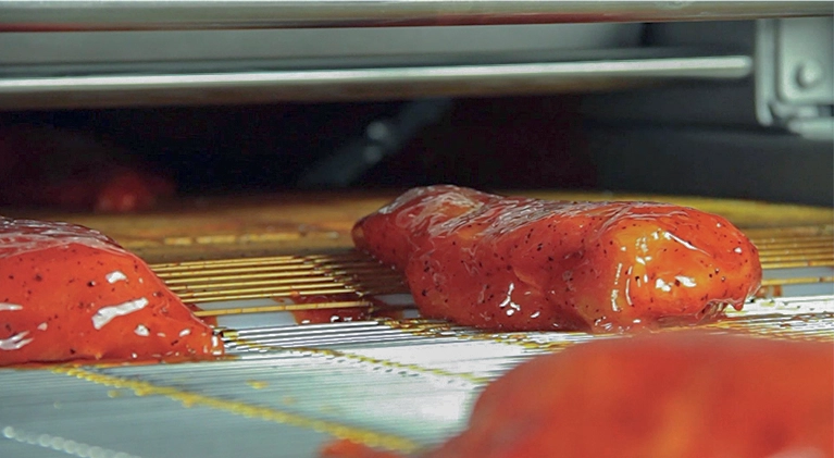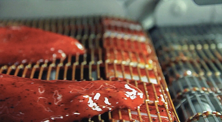 Viscous, non-pumpable materials like heavy liquid batters, tempura, and marinades can be applied to your product particularly well with our alco dipper. The products sit in between an upper and lower belt and are guided through a bath of coating media, e.g. a BBQ marinade or tempura batter. By means of an adjustable blower system, the excess coating material can be removed. That way, you get a product according to your taste.