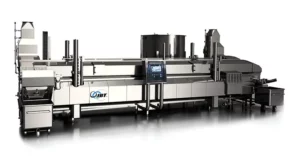 - Adjustable lower coating bed depth, top flow hopper discharge and breading sifter