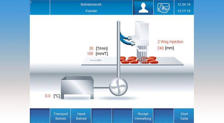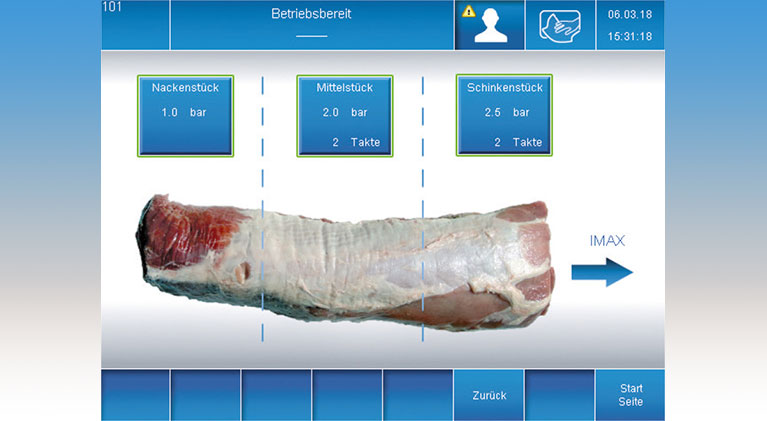 - For the IMAX walking beam injectors, the meat is transported through the machine via a transport rake. This follows a flat elliptic curve. While the needles are outside the product, the rake lifts out of the transport bed and moves forward. In the controller, this product advance can be set to 50 mm or 100 mm. The bigger advance allows the largest transport capacity of the injector with a wide puncture pattern. Although the shorter 50 mm advance halves the capacity, but it provides a stitch pattern that is twice as narrow, which can bring technological advantages when injecting. Thus, the short advance is often used to achieve a high injection rate for products or to ensure perfect brine distribution with very low pressure.
