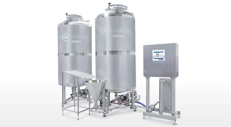 - O misturador BRIMAX garante a fusão precisa de componentes sólidos e líquidos, procedimentos guiados pelo sistema, processos de mistura controlados até o resultado monitorado automaticamente da salmoura acabada e devidamente resfriada