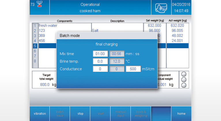 A tecnologia BRIMAX permite a produção de todos os tipos de salmoura usados em procedimentos de injeção, massificação e/ou tombamento, mantendo a qualidade padronizada do produto sob os mais rigorosos requisitos de higiene. Um recurso exclusivo é o software, que foi desenvolvido e aperfeiçoado com base em anos de experiência, que executa, controla e documenta todo o sistema, como o operador.