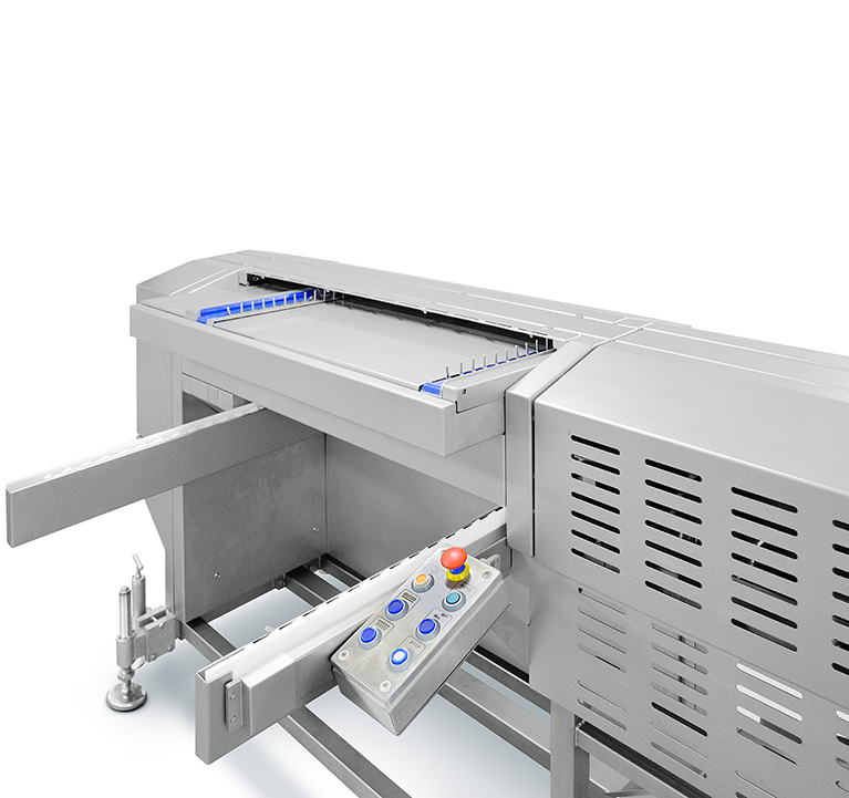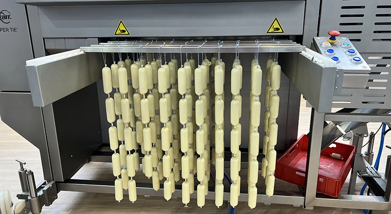 - Produção flexível e de alta capacidade - O sistema pode lidar facilmente com salsichas em tripas plásticas, fibrosas e de colágeno. O modelo básico pode acomodar calibres de 20 mm a 120 mm com um comprimento máximo de salsicha/corda de 800 mm.