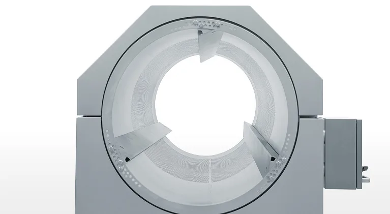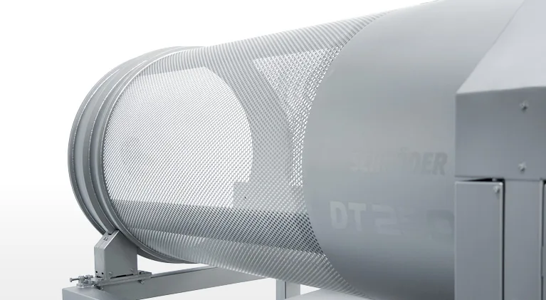 - O transporte do produto é feito por meio do movimento de rotação do tambor. A inclinação ajustável do tambor garante o movimento contínuo do produto pelo sistema.