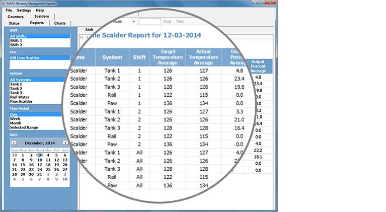 - Relatórios abrangentes para monitorar a eficiência - Nosso sistema de relatórios fornece relatórios detalhados de eventos, inclusive quando a temperatura-alvo do scalder saiu da faixa, voltou para a faixa ou foi alterada, e quando a temperatura de compensação foi alterada. Gráficos detalhados também podem ser gerados, mostrando a temperatura real e a temperatura alvo para o turno, a linha, o sistema ou o intervalo de datas selecionado.