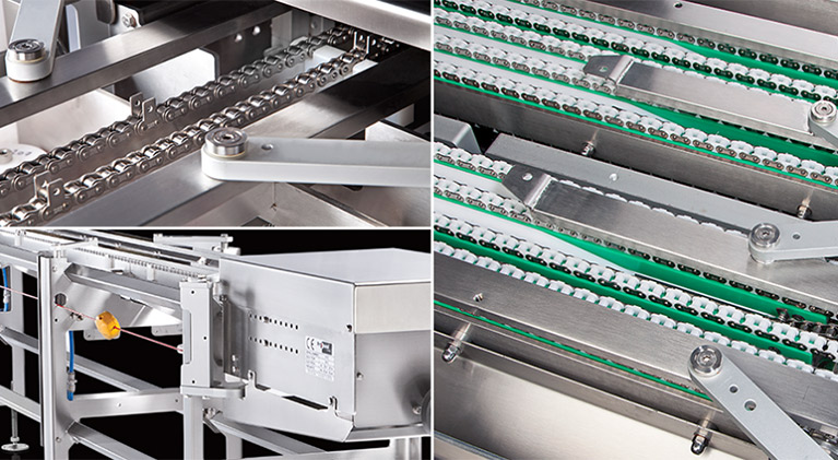 - O design modular permite que o cliente especifique o comprimento, a largura e o passo da bandeja do transportador
